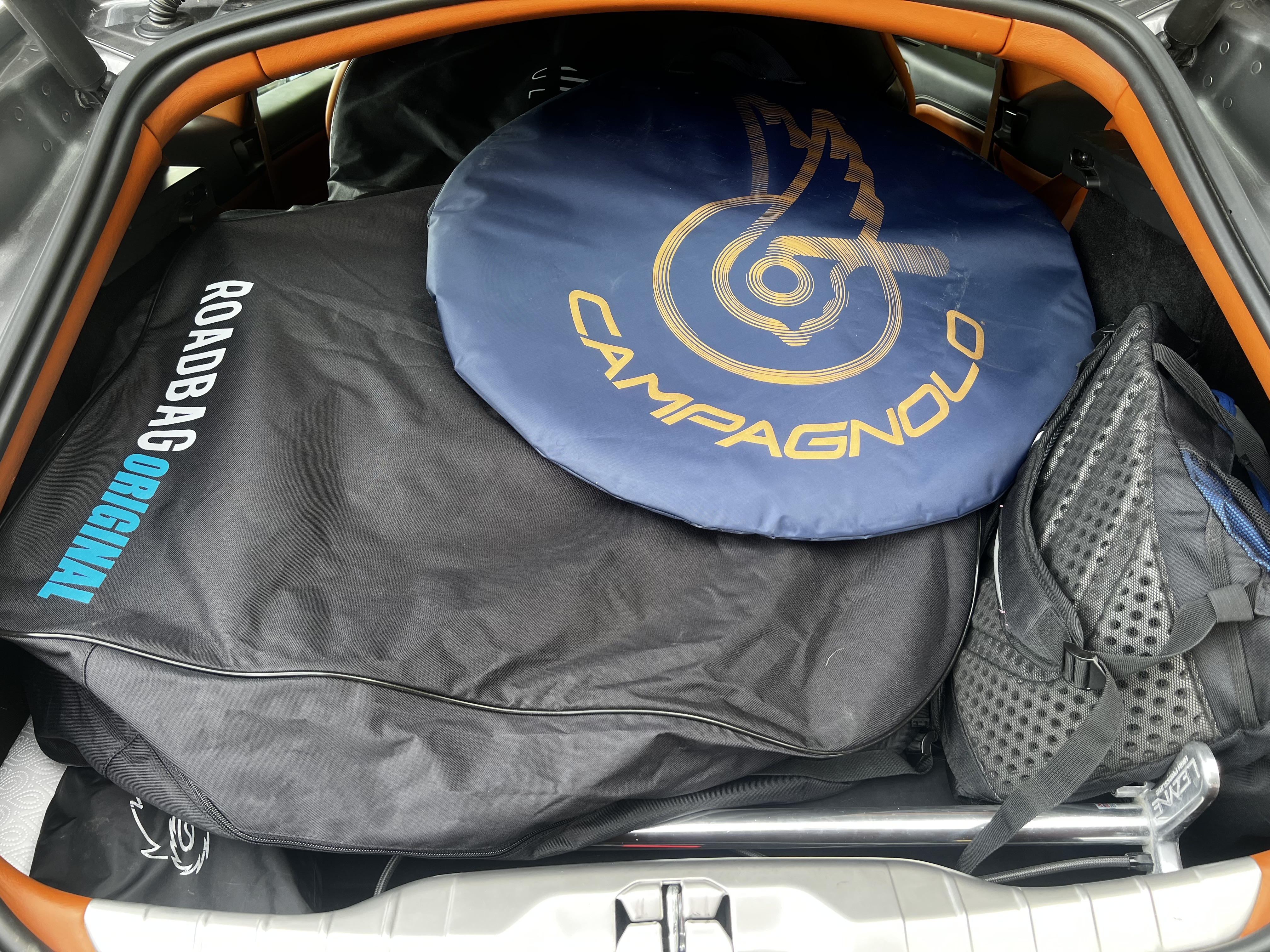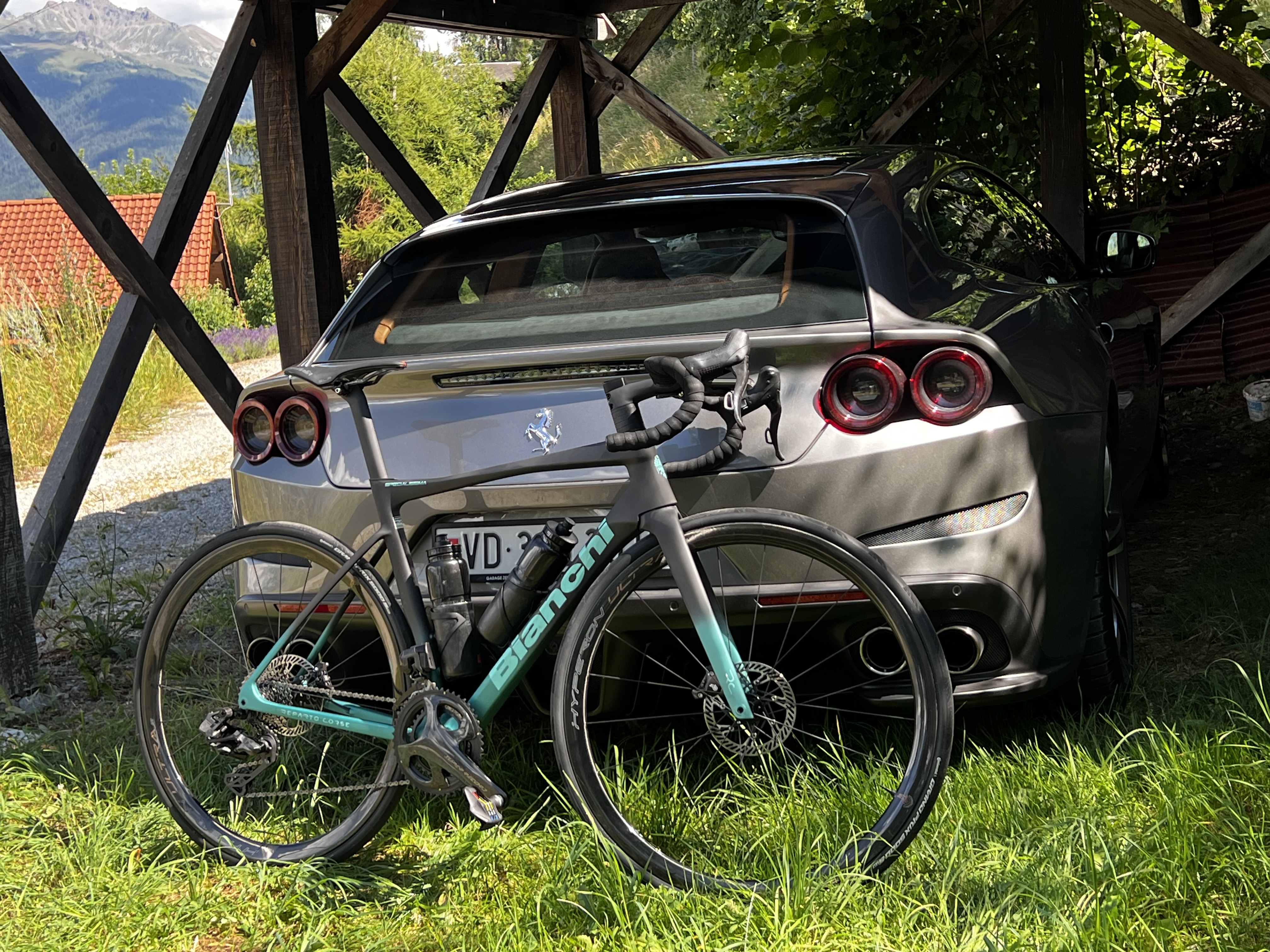 La classe, Romain, le vélo dans sa housse, et le tout dans le coffre de la Ferrari GTC4 ! Sportif au volant, mais aussi dans les mollets.