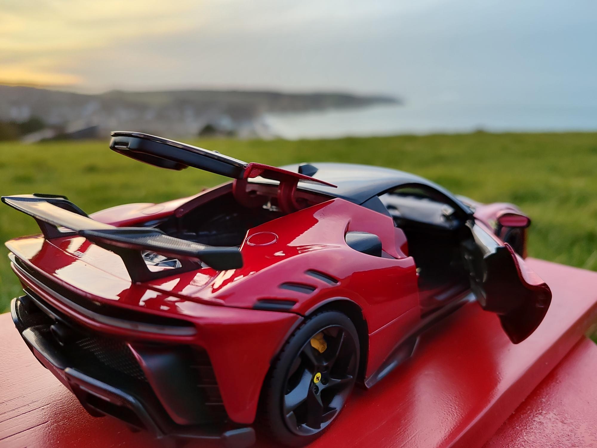 Plus modestement, la SF90 XX de chez Burago mais dans une belle livrée rosso magma intérieur beige jantes noires.