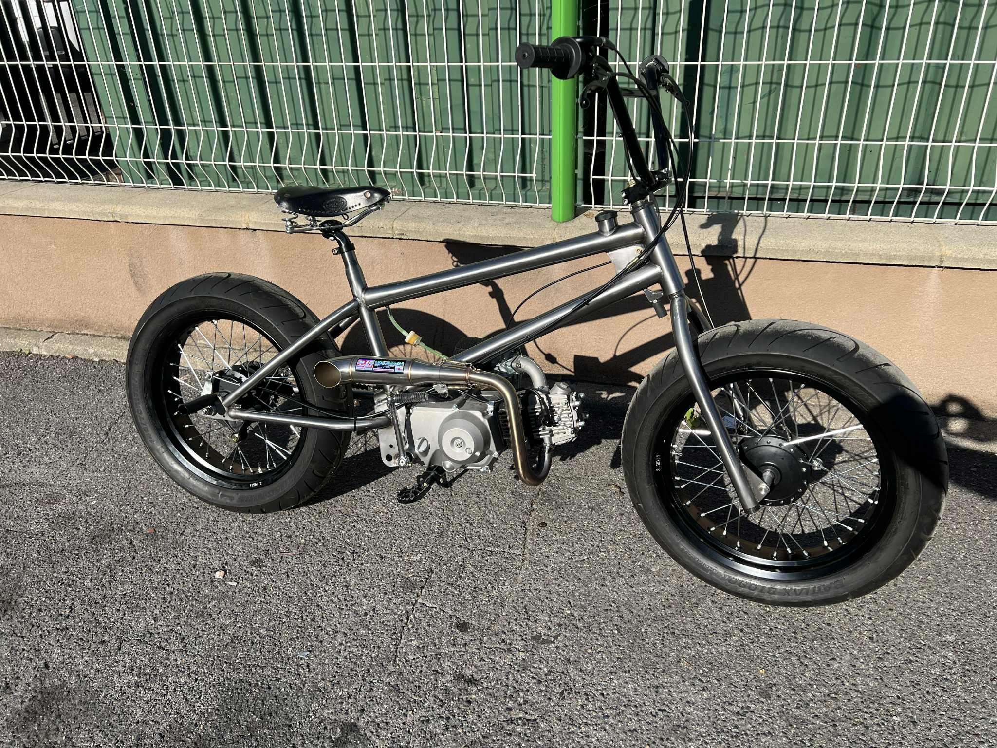 110cm3 (je voulais pouvoir circuler à 2, il y a des repose-pieds ar), cadre acier du marché asiatique, modifié, brossé et vernis, à peu près tout le reste a été fabriqué ou adapté/modifié