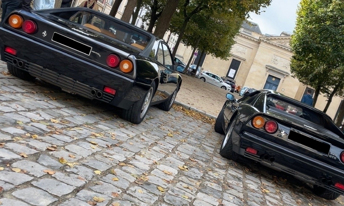 J'aime beaucoup cette photo des 'Dark Sisters' sur le parvis de la cathédrale St Louis à Versailles : c'est côte à côte qu'on réalise la différence de gabarit  : la superbe 328 GTS ferait presque 'miniature' à côté (7 cm en largeur et 27 cm en longueur en plus, çà change une échelle ^^) !