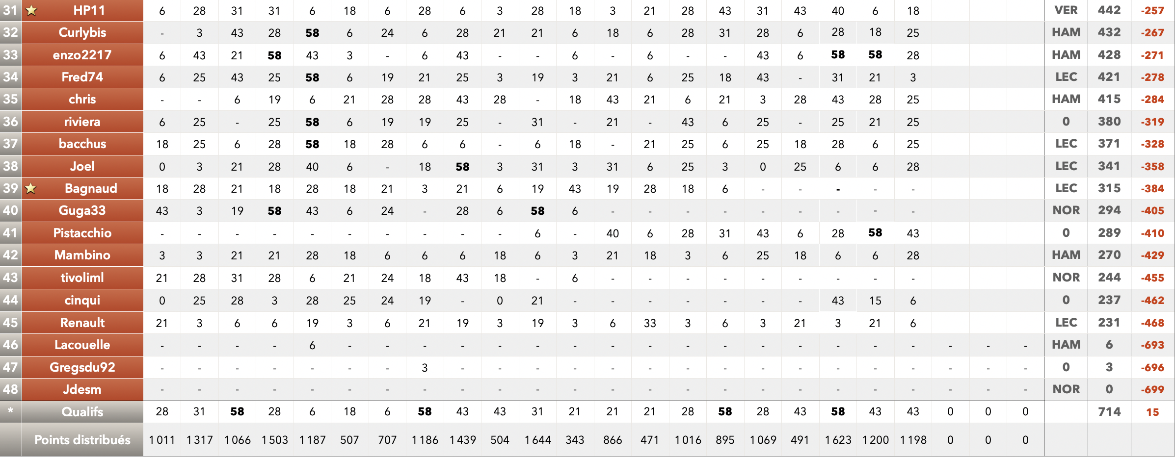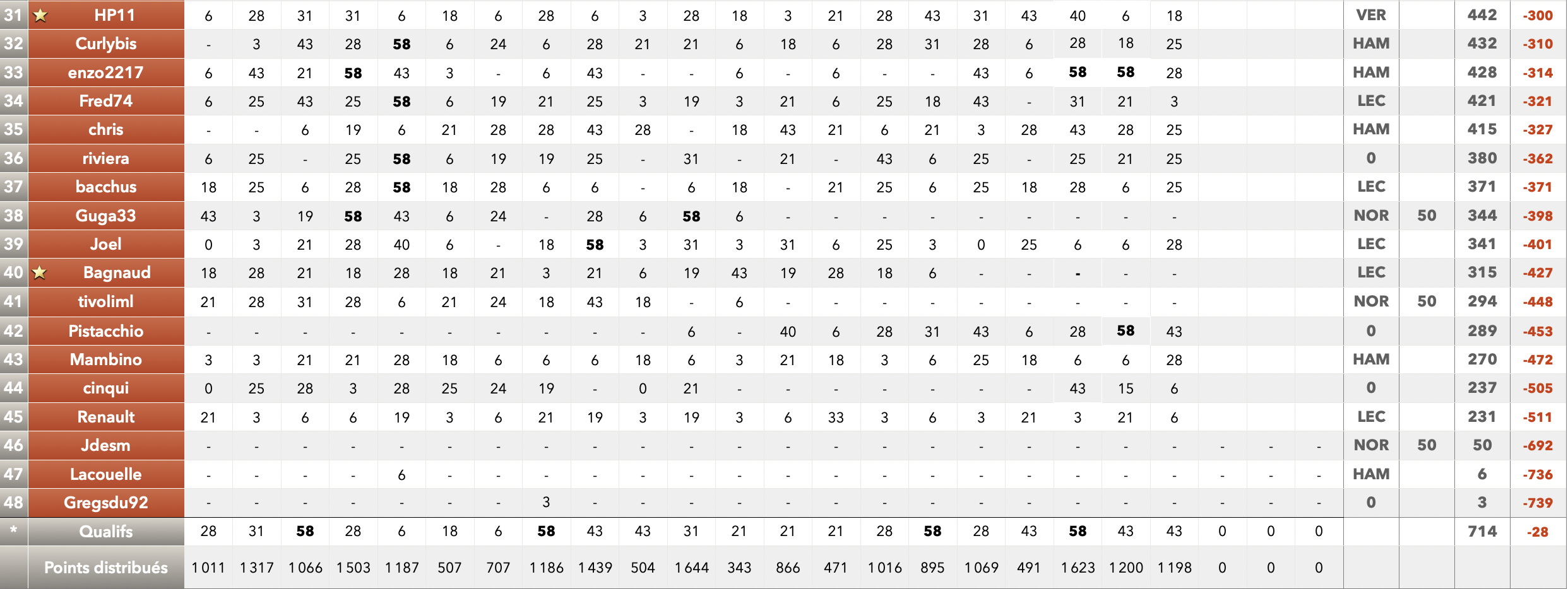 Mais si @RR16 ne marquera pas les 50 pts de bonus (ayant joué Hamilton champion) @FCT-95 a joué Norris et @Mike051 a joué Piastri.  Le final devrait se jouer entre ces deux-la. Mais sait-on jamais...