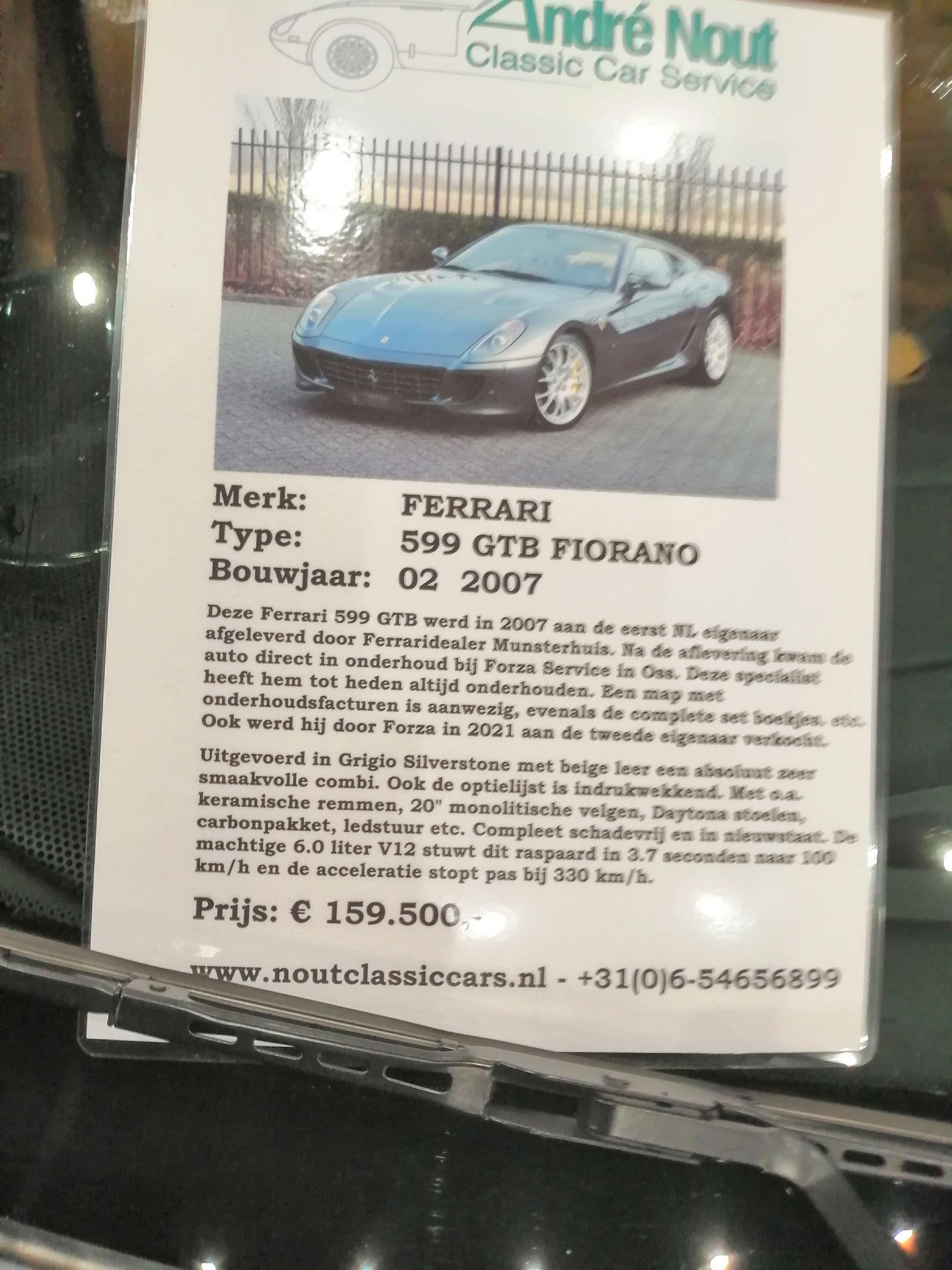 Chez Nout Classic Car Service  Ferrari 599 GTB Fiorano 02/07 Grigio Silverstone /  Beige 40267 kms 159500 €