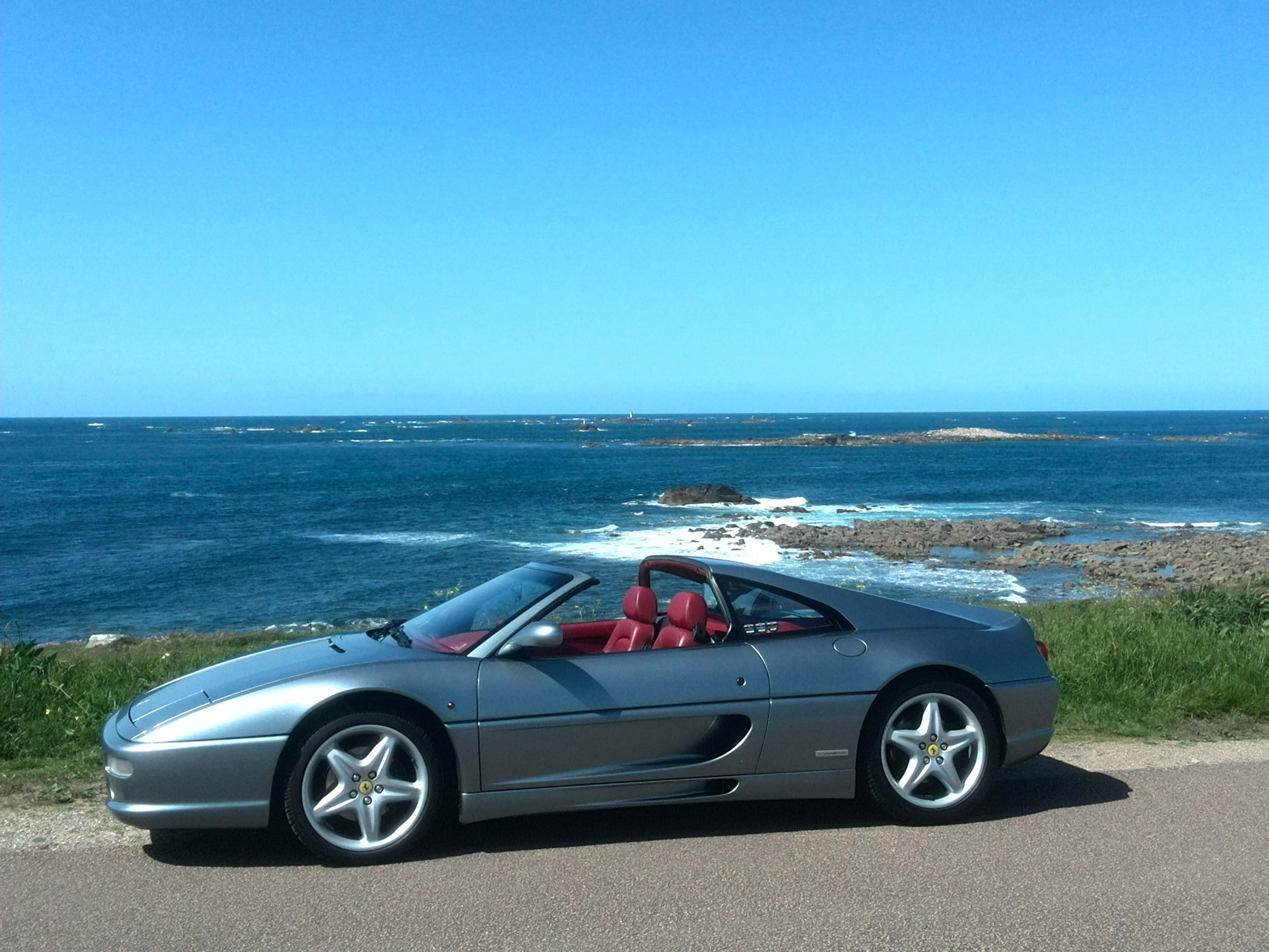 Magnifique : une Ferrari F355 GTS sans le toit, en bord de côte sous le soleil de Bretagne, avec une belle collection d'autocollants ! :wub::wub::wub: