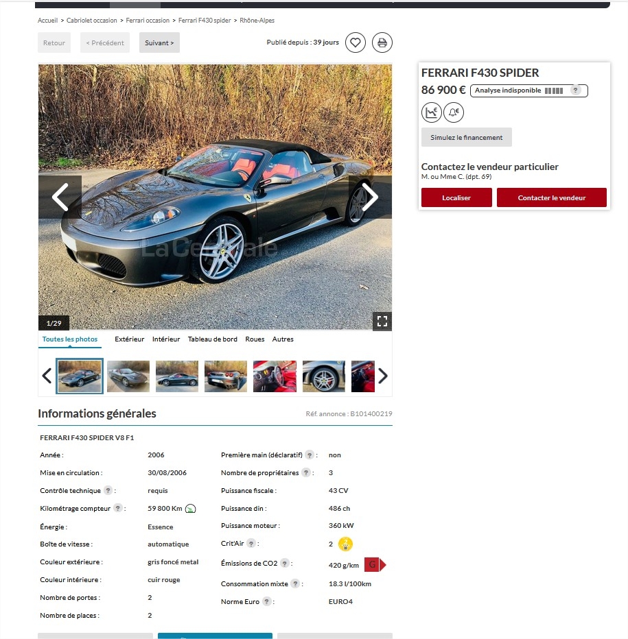 85k€ pour un 430 spider  , c'est finalement bas quand tu vois le reste du positionnement " annonces"  de la gamme féfé ( 360 , 355 etc  )